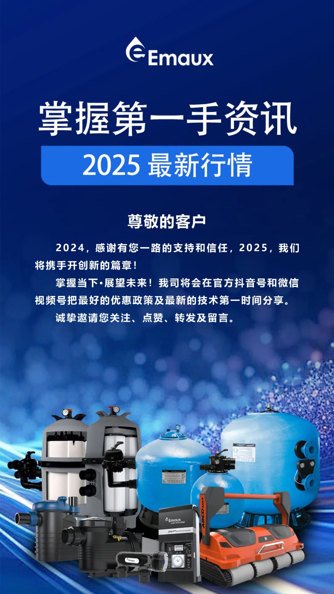 意萬仕集團(Emaux Group),國際水處理行業(yè)領軍企業(yè)之一,我們在游泳池行業(yè)擁有40多年豐富的知識,是一家用心為您提供泳池設備解決方案的專業(yè)生產(chǎn)商, 為全球十大泳池設備供貨商之一。 集團擁有超過10萬平方米的生產(chǎn)基地,集研發(fā)、生產(chǎn)、質(zhì)量控制、培訓, 銷售和售后支持于一體,確保我們的工廠能夠為客戶提供多樣化和創(chuàng)新的泳池和各類水處理設備,滿足高標準的質(zhì)量,性能和設計.